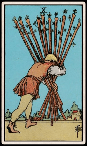 The Ten of Wands is a card that typically symbolizes burden, responsibility, and feeling overwhelmed or experiencing excessive pressure in your life.