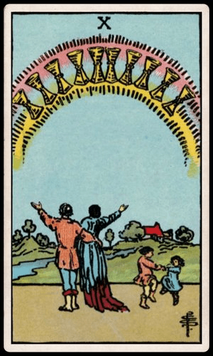 Depicted on the card is a joyful family, celebrating their love and harmony. It represents the ultimate state of emotional well-being, where deep connections and love are found within one’s own family or chosen community. This card symbolizes finding peace and happiness in the loving relationships that bring us a sense of belonging and unity. It reminds us to appreciate the blessings of those who are closest to us, creating a sense of shared joy, harmony, and fulfillment that radiates from within. When the Ten of Cups appears in a reading, it serves as a reminder to cherish and nurture the connections that bring us happiness and to celebrate the love that surrounds us.