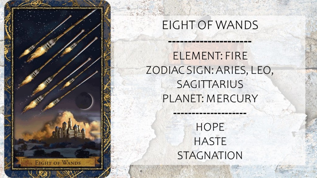 This card reminds you that the answers you seek will emerge in due time. Don’t rush into decisions or try to force outcomes. Instead, trust in the natural flow of events and allow yourself to be guided by your intuition. The Eight of Wands signifies a time of forward momentum, so even if you’re unsure of the exact path to take, keep moving forward.
