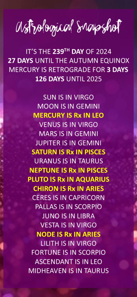 Meanwhile, the Sun’s alignment with your Ascendant in Leo casts a spotlight on your expressive nature. Your charm and wit are magnetic, drawing others into your orbit with ease. However, Mercury’s retrograde journey through Virgo and Leo reminds you to be mindful of your words. Choose them carefully, ensuring they reflect your true intentions and avoid any potential misunderstandings.