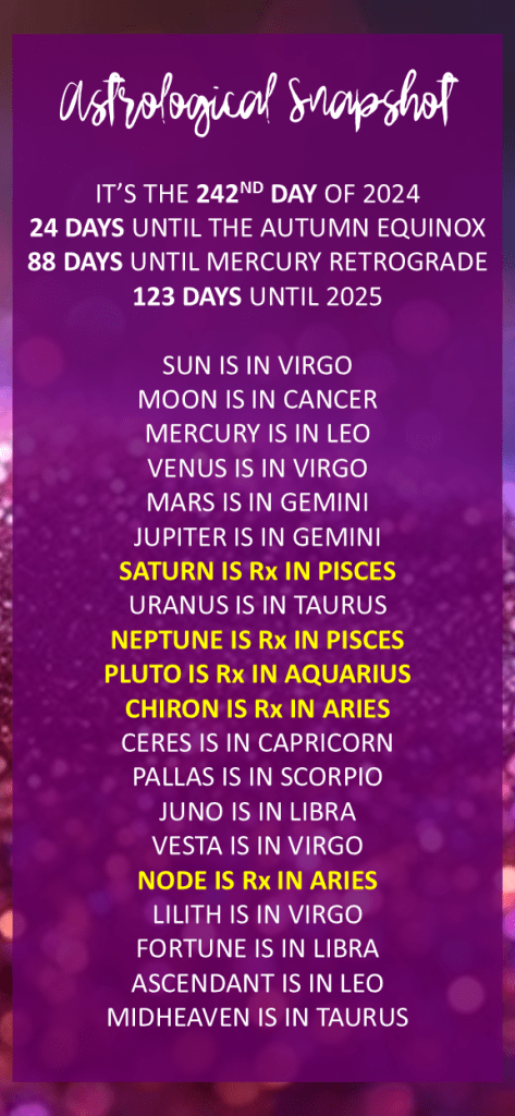 While the air signs dominate the day, the Sun in Virgo and Moon in Cancer provide a grounding influence. The Sun’s earthy energy encourages you to pay attention to the details and ensure that your actions are aligned with your long-term goals. Meanwhile, the Moon in Cancer reminds you to nurture your emotional well-being and create a safe haven for yourself amidst the flurry of activity.