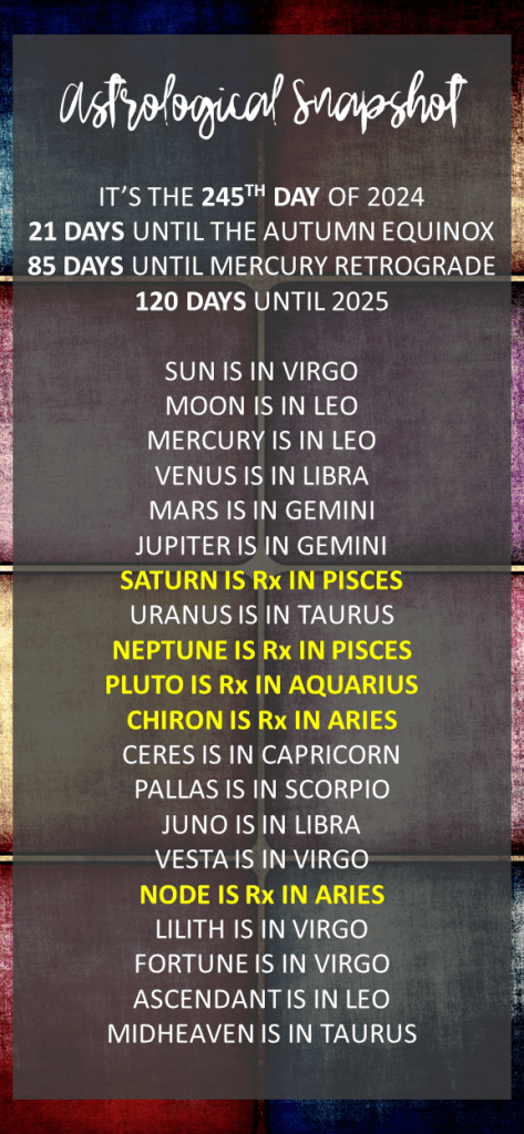 Sun in Virgo trine Uranus in Taurus: This grounded earth trine signals a period of practical innovation. Virgo’s meticulous energy harmonizes with Uranus’s disruptive brilliance, offering opportunities to implement new ideas in tangible ways. Gemini, with your innate curiosity, you’re likely to be drawn to exploring these new avenues. Don’t be afraid to experiment and break free from routine.