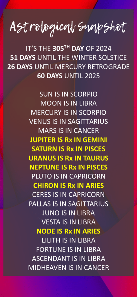 The Sun’s journey through Scorpio casts a penetrating light on your sixth house of health, daily routines, and service to others. This transit encourages you to delve into the depths of your physical and mental well-being, seeking ways to optimize your daily habits and create a more balanced lifestyle. You may feel drawn to explore alternative healing modalities or deepen your understanding of holistic health practices.