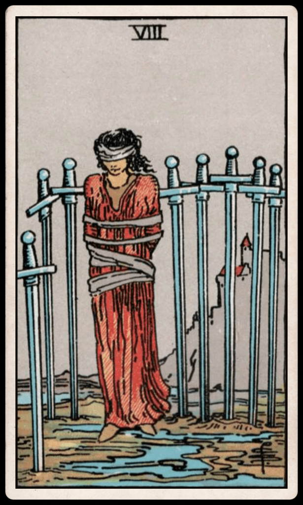 The Eight of Swords invites you to step back and examine the mental barriers you may have unconsciously erected. Are you allowing fear, doubt, or past experiences to hold you back from pursuing your dreams and expressing your true potential? This card encourages you to recognize that these limitations are often self-created, and the power to break free lies within you.