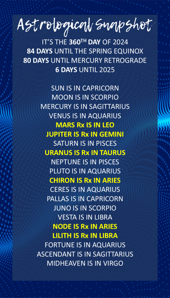 The Moon’s journey through Scorpio and your sixth house of health and daily routines emphasizes the importance of self-care and mindful habits. Pay attention to your physical and emotional well-being, ensuring that you are prioritizing your needs amidst the festive bustle. This is an excellent time to establish healthy routines, engage in activities that nourish your mind and body, and find moments of stillness to recharge your batteries.