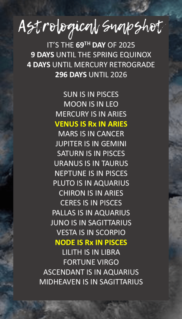 Your ruling planet, Mercury, in Aries (8°30′), is closely conjunct retrograde Venus (9°01′). ♈️ This highlights a significant focus on communication within relationships and a reevaluation of your values. Expect a flurry of thoughts and conversations, especially concerning matters of the heart. The fact that Mercury will station retrograde on March 15th, straddling Pisces and Aries, makes this period even more crucial for you. This retrograde will significantly impact your communication, thought processes, and information flow. You might find yourself revisiting past conversations, clarifying misunderstandings, or rethinking your approach to sharing information.