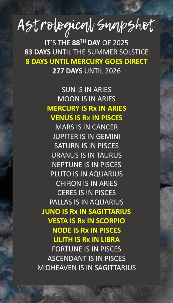 Mercury, the planet of your ruling sign, swims in the fluid depths of Pisces. This placement heightens your imaginative thinking and empathetic communication, but also carries the risk of mental escapism or a tendency to avoid concrete details. You are likely to feel a heightened sense of artistic inspiration, and the ability to communicate with a deeper emotional tone. You may also find that your dreams are vivid and meaningful. 💭