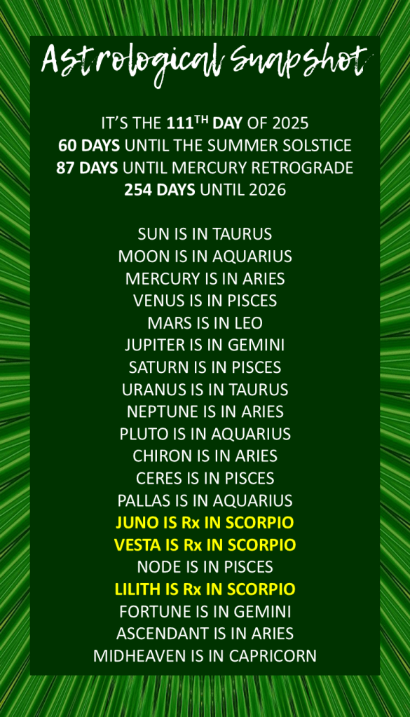 Communication and your local environment are highly energized, with Mars blazing through Leo in your third house. You might feel driven to speak your mind, engage in lively debates, or be much busier in your immediate surroundings. Your chart ruler, Mercury, speeds through Aries in your eleventh house of groups, friendships, and future aspirations, further fueling quick connections and social brainstorming. Mercury’s trine to Mars creates an easy flow between expressing yourself locally and connecting with groups or friends. However, Mars opposes transformative Pluto in your ninth house of beliefs, indicating potential for intense discussions, power struggles over ideas, or challenges related to travel or education plans. Mercury’s proximity to Neptune adds intuition but also potential fog to group communications or future plans, while its sextile to Pluto hints at the power of insightful conversations within your network.