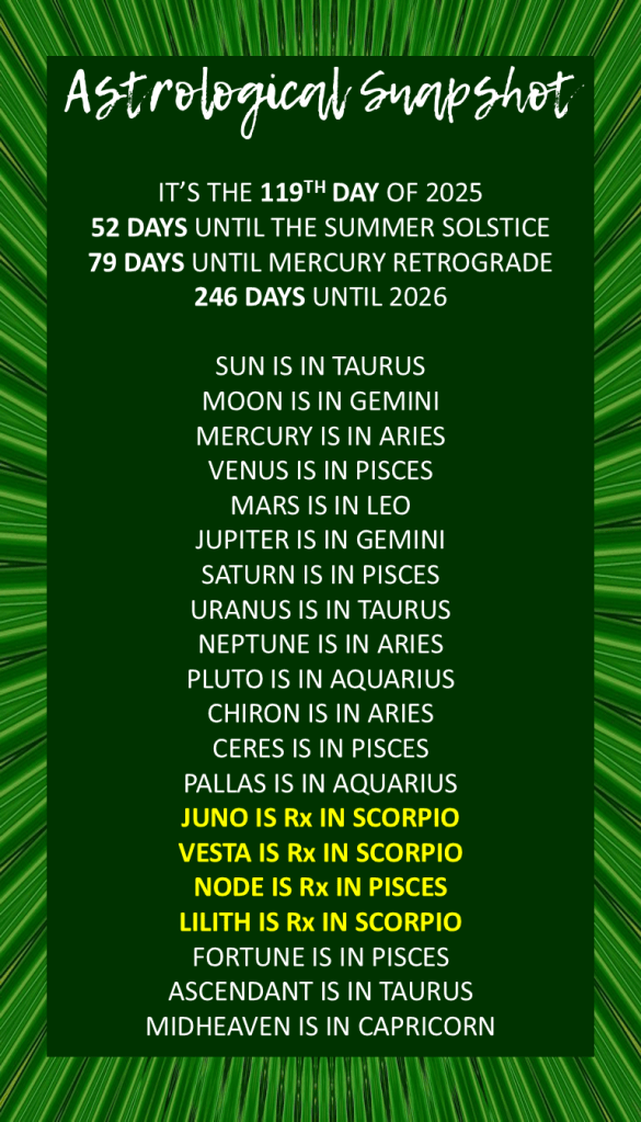 Even with this outward focus on self and networks, the Sun’s transit through Taurus in your 12th house suggests a simultaneous need for some quiet time, introspection, or attention to behind-the-scenes matters 🤫<0xE2><0xAA><0x95>️. There might be subconscious patterns or hidden factors influencing you, requiring periods of retreat to process or integrate them amidst the day’s buzz.