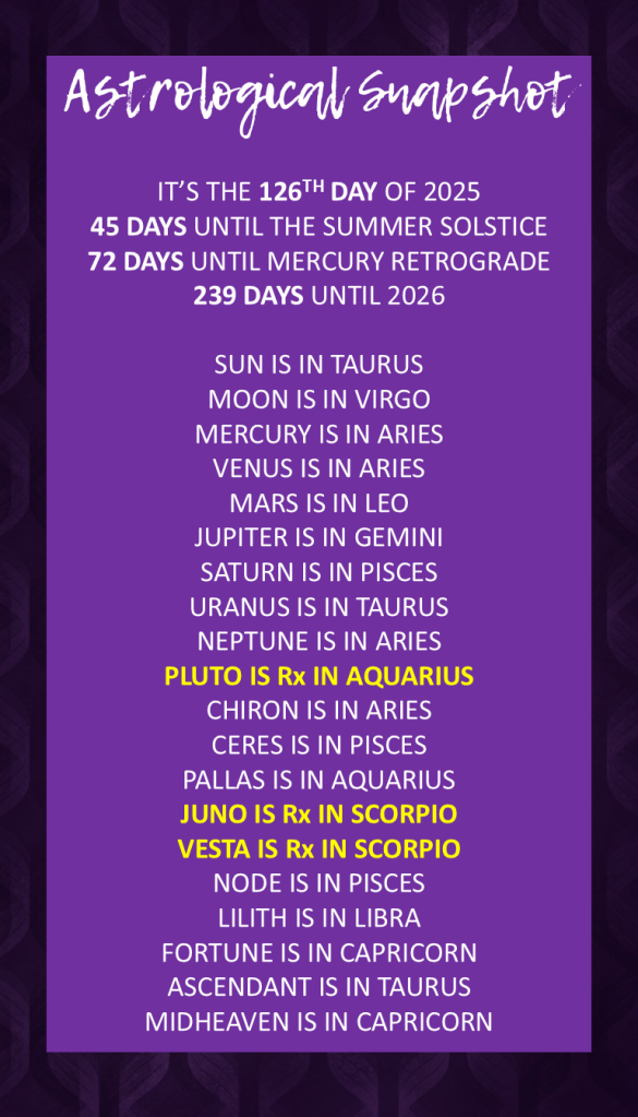 The Sun in Taurus, moving through a more private sector of your chart, forms a supportive angle with the Waxing Gibbous Moon in meticulous Virgo, which highlights your home and emotional foundations 🏡🧘♀️🌿. This suggests that quiet reflection, attending to your inner well-being, and perhaps organizing your personal sanctuary can bring a deep sense of practical comfort and emotional clarity today. It’s about finding peace within so you can better navigate the bustling world outside.