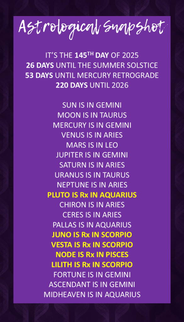 The Moon in Taurus at 25°05′, preparing for its transformative New Moon in Gemini later in the day, is a significant marker for your twelfth house. This placement encourages a quiet period of introspection, perhaps a subconscious clearing, before the powerful surge of new beginnings in your first house. While your Gemini Rising nature thrives on outward interaction, this lunar energy gently nudges you to connect with your inner emotional landscape, allowing for a deeper understanding of your core values and needs. This New Moon, occurring in your first house, marks a powerful fresh start for your personal identity, offering you the opportunity to redefine how you present yourself and what new experiences you wish to embody.