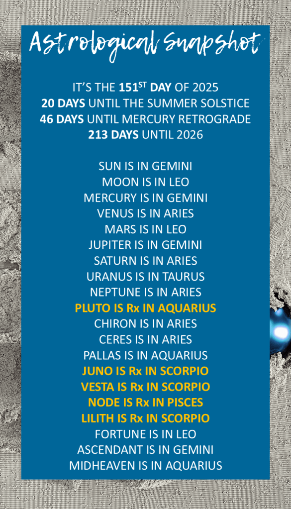 With the Sun ☀️, Mercury communicative 🗣️, and Jupiter expansive 🔭 all residing in Gemini, your core element of Air is profoundly activated. This concentration of energy in your ruling sign amplifies your natural curiosity, intellectual agility, and desire for connection. You’ll likely feel an enhanced mental sharpness, a heightened ability to articulate your thoughts, and a strong inclination to engage in stimulating conversations. Opportunities for learning, sharing information, and networking will feel abundant. This is an optimal time to initiate intellectual projects, to dive into new subjects, or to simply enjoy the free flow of ideas. Your mind, already a bustling marketplace of concepts, will feel even more vibrant and quick-witted, allowing you to connect disparate pieces of information with ease.
