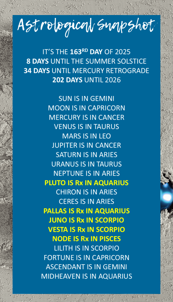 ♊ Today, the Sun continues its journey through agile Gemini at 21°41′, illuminating our minds with curiosity and a desire for connection and understanding. This emphasis on communication and information exchange is further heightened by Mercury, the planet of thought, now in nurturing Cancer at 6°46′. This alignment encourages a more emotionally intuitive approach to how we process and convey information, urging us to speak from the heart and listen with empathy. ❤️