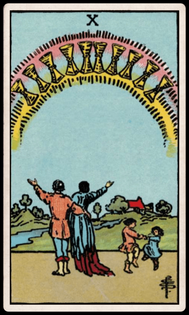 The Ten of Cups is as much about your personal growth and evolution as it is about your interactions with others. The sense of completion it heralds doesn’t necessarily have to manifest as an external event; it can, just as powerfully, occur within. This card serves as a reminder for everyone to cultivate a deep and abiding love for themselves, finding a sense of wholeness and contentment from within, which then radiates outwards to enrich all aspects of life. It’s a day for holistic emotional well-being and shared happiness.