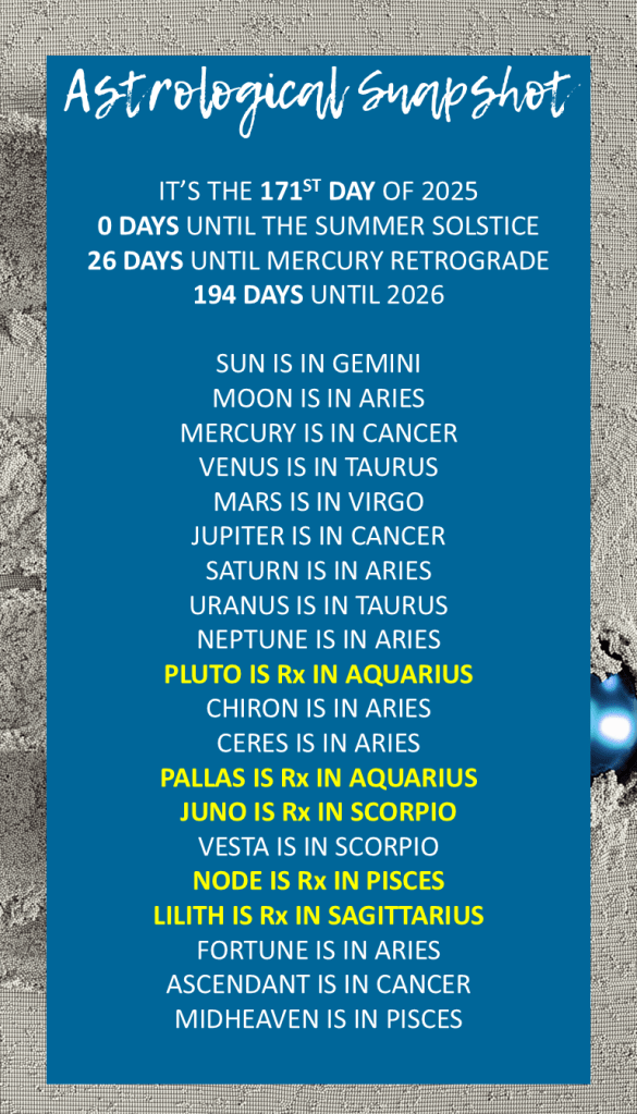 Looking ahead, the Sun’s entry into Cancer later today marks the Summer Solstice, a pivotal shift that deepens our collective focus on emotional security, home, and nurturing connections. For you, this means a natural shift from intense mental output to building emotional comfort and valuing what brings you security. This, combined with the beneficial sextiles from Mars to Jupiter and the Ascendant, offers an underlying current of supportive energy for taking practical steps that align with your growth and self-expression. The day invites you to honor your need for emotional comfort while strategically navigating opportunities for growth and practical application.