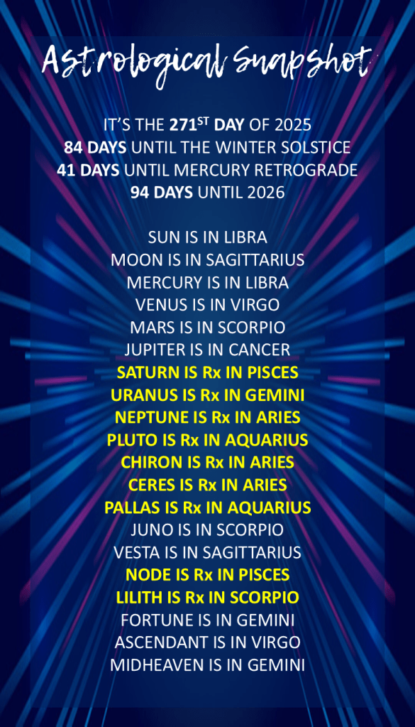 Looking forward, the long-term changes are highly supportive of your intellectual element. Uranus in your own sign, Gemini (1∘14′ retrograde), is forming a magnificent Trine to Pluto in Aquarius (1∘25′ retrograde). This powerful Air alignment gives you the green light for innovative, intellectual breakthroughs. This is the energy of revolutionary ideas that become surprisingly easy to integrate into your life, especially concerning your identity and personal projects. The seeds of long-term freedom and profound mental restructuring are being sown right now, helping you shed outdated beliefs and embrace a future-focused vision. 🚀 Your challenge is to use your innate Gemini wit to manage the immediate, heavy Saturnian duties so you can fully capitalize on this exhilarating, electrifying Air support.