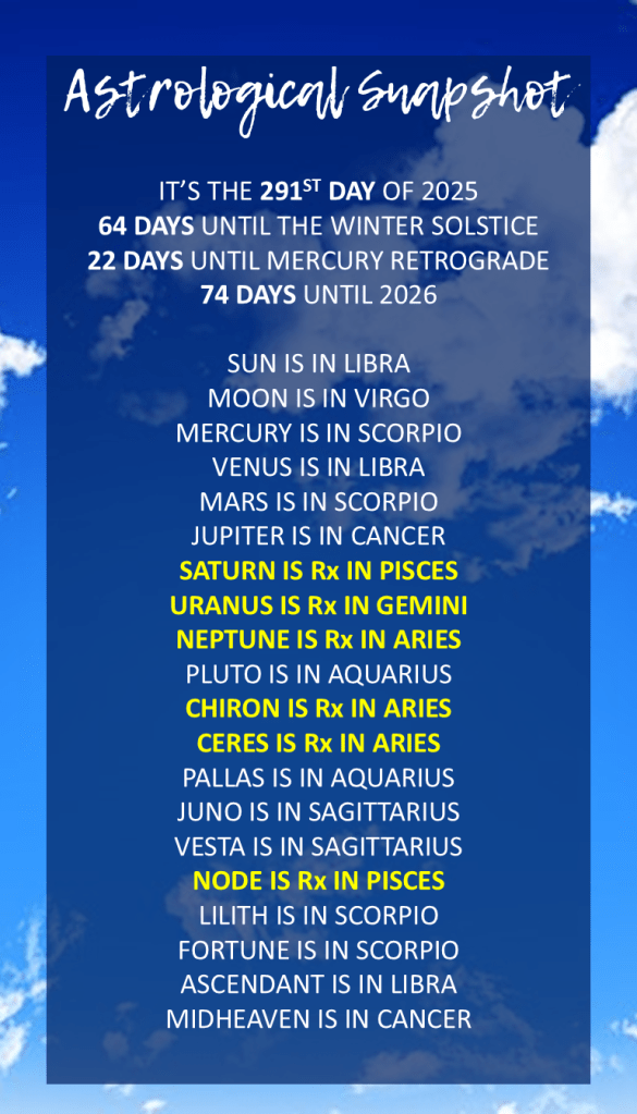 Meanwhile, the Sun in balancing Libra is providing a pleasant, harmonious glow to your fifth house of creativity, pleasure, and romance. This softens the intense focus of the Scorpio placements, ensuring that your pursuit of efficiency is balanced by a need for beautiful, enjoyable results. This encourages you to channel your disciplined energy into creative ventures that feel fair, balanced, and aesthetically pleasing. Look for ways to connect with others through shared artistic or intellectual pursuits.