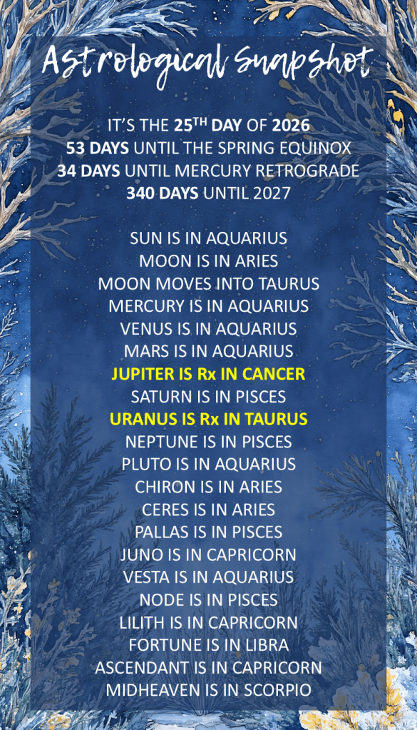 However, the day carries a heavy undercurrent of power and necessity. With Mars and Pluto also joined in Aquarius, your drive is no longer satisfied with surface-level variety. You are being pushed to find the “why” behind your “what.” This isn’t just about collecting information; it is about weaponizing that information to create systemic change in your life. You may feel a restless energy to learn a new skill, plan a significant journey, or pivot your public messaging. The square from the Moon in Taurus at 25°37° serves as your grounding wire. It may manifest as a sudden need to stop the mental spinning and actually tend to your physical surroundings. If you feel a momentary friction between your grand ideas and your daily chores, see it as a reminder that even the most brilliant blueprint needs a solid foundation to stand on.