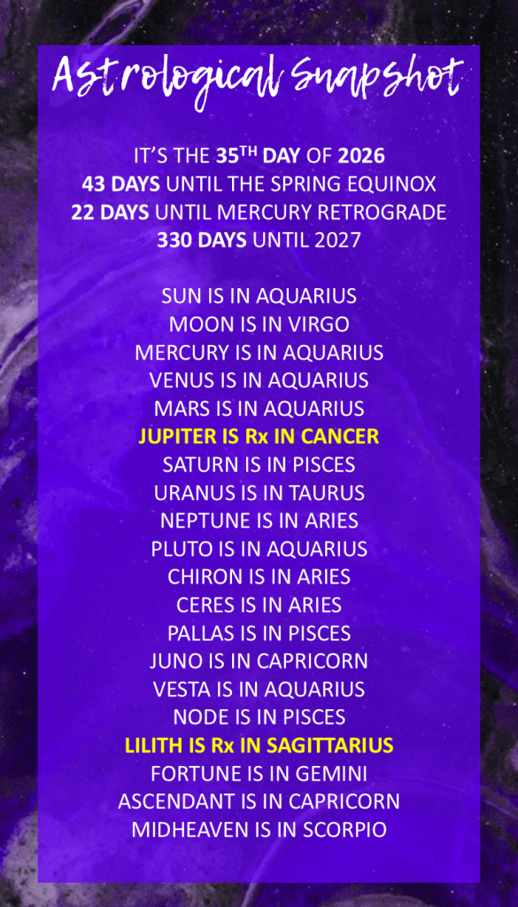 Your emotional landscape is governed today by the Moon in Virgo at 17°33′. This placement brings a much-needed groundedness to your airy day, encouraging you to channel your restless energy into tangible organization. While the Aquarius planets want you to dream of the next decade, the Virgo Moon asks you to fix the small details of your immediate surroundings. This creates a highly productive tension. You are capable of seeing the big picture and the fine print simultaneously, making it an excellent time for editing, refining, or troubleshooting a project that has felt stagnant. 📝