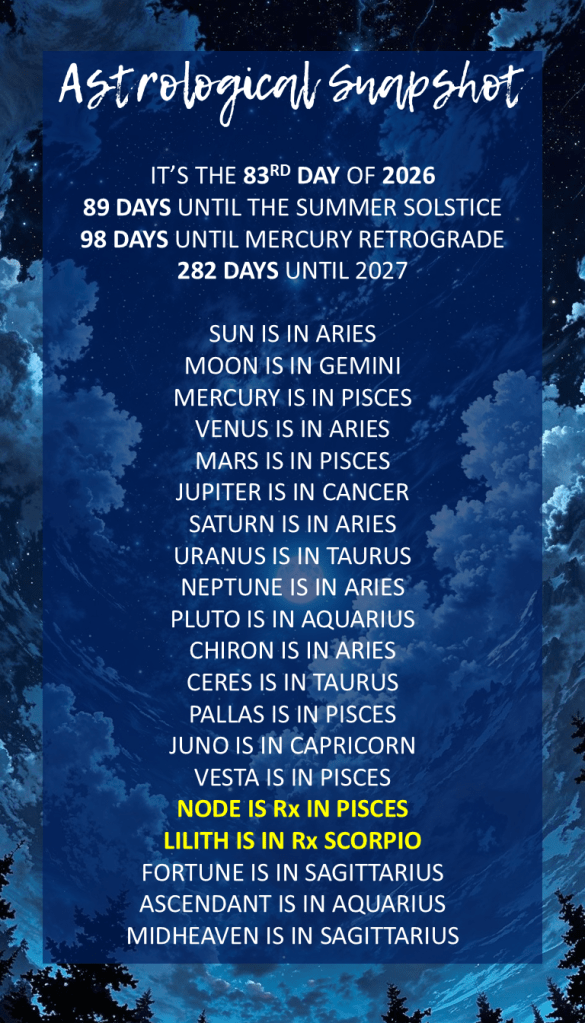The heavy, disciplined influence of the Sun and Saturn in Aries at 3°45′ and 4°36′ provides the structural integrity needed to begin this restoration. You are being asked to take real, tangible action to clear the fog of Neptune and the debris of past choices. Whether this pollution exists in your physical environment—like the neglected corners of your home—or in the mental clutter that has been lingering, the act of cleaning house provides you with a steady sense of direction. By remaining a dedicated student of your own life and taking responsibility for the state of your internal world, you find that your path forward becomes significantly clearer and more intentional.