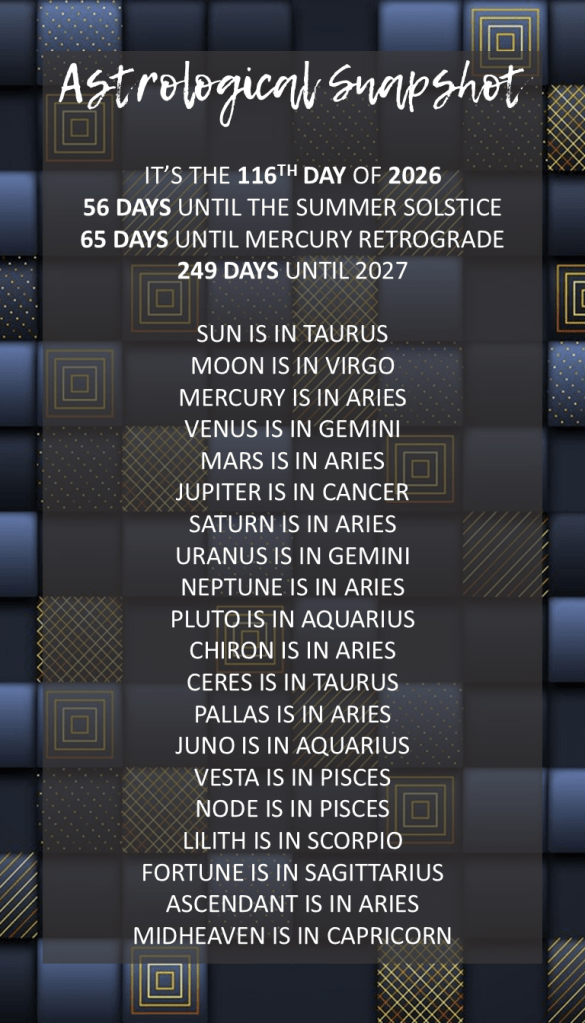 The planet of passionate desires moves into sensual Taurus for the next several weeks as we a determined to get what we want. Take things slow and steady, as we have the tenacity to achieve our desires. Just don’t get too stagnant.